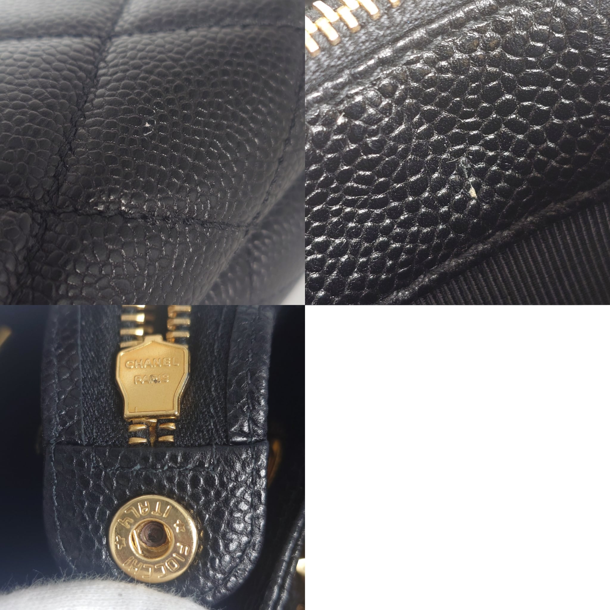 上質なキャビアスキンに、シャネルを象徴するマトラッセステッチとココマークのゴールド金具が映える、タイムレスな魅力を放つ逸品です。